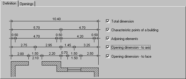 - Opening dimension - to axis - select this to add dimensions between characteristic points of an object and opening axes. A description of a dimension line depends on the parameters specified on the Openings tab