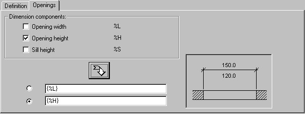 Use the options on this tab to determine a method of describing a dimension line for openings (opening dimension - to face). The description of an opening dimension line may consist of: