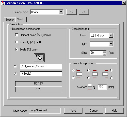 Use this dialog to specify parameters of section symbols and descriptions of views as they display in formwork drawings.