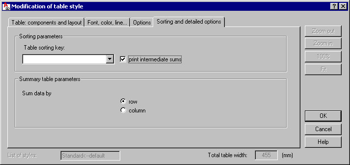 On the Sorting and detailed options tab of the Definition/modification of a table style dialog, you can define table sorting and summary parameters.