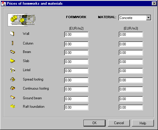 Use the options on the Prices of formworks and materials dialog to select prices of formworks for RC structure elements and prices of materials (such as concrete, steel, and timber). These prices will be used in tables generated by the software.