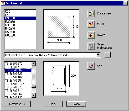 Modify - opens the Section modification dialog where you can modify parameters (such as name and dimensions) of a selected section. |