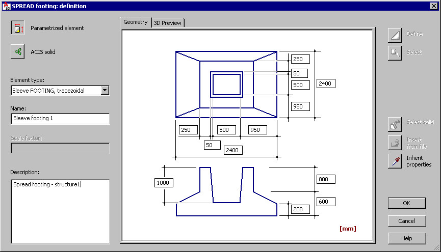 In the element definition dialog, you can define prefabricated, volumetric elements of complex geometry, such as spread footings and stairs.