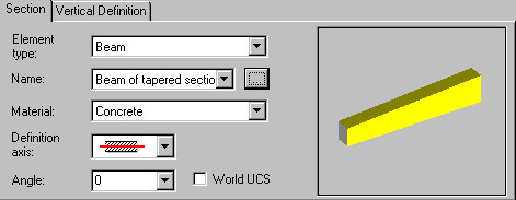 - Angle of rotation of the element cross-section - for all element types except walls. Select an available value (0, 45, 90, 135, or 180) or enter a different value. The definition of this angle refers to the current (local) system of coordinates. If you are defining a prefabricated element that lies on an inclined plane, you can select World UCS to define the orientation of the element cross-section with respect to the global coordinate system.