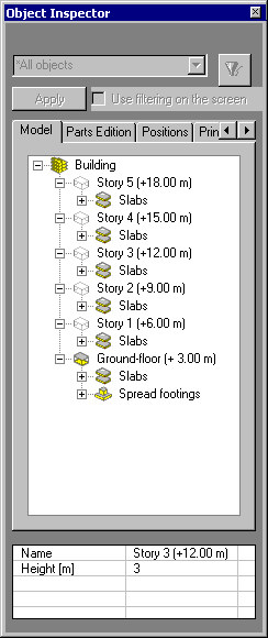 - Tabs that display lists (sets) of project elements depending on the design stage (modeling / positions / printouts)