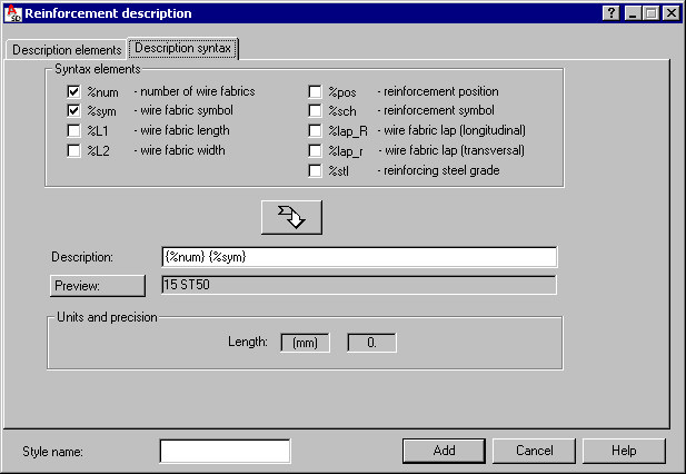 On the Description syntax tab of the Reinforcement description (wire fabric distribution) dialog, you can define the description syntax of wire fabric distribution.