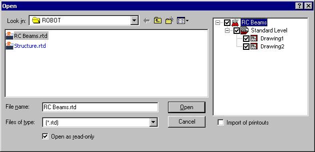 In the Open dialog (shown below), select a drawing from the tree located in the right-hand side of the dialog (in this case these are Drawing1 and Drawing2 on the standard level, belonging to the RC Beams project).