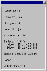 When selected, the cursor changes to a ‘cross’. When the cursor is located close to a reinforcement position (reinforcing bar, reinforcement distribution) presented in a drawing, a small dialog displays, and information concerning the selected reinforcement is presented. If any information about reinforcement is inaccessible (e.g. position no. or spacing), then a '---' symbol displays. An example of reinforcement information is shown below.