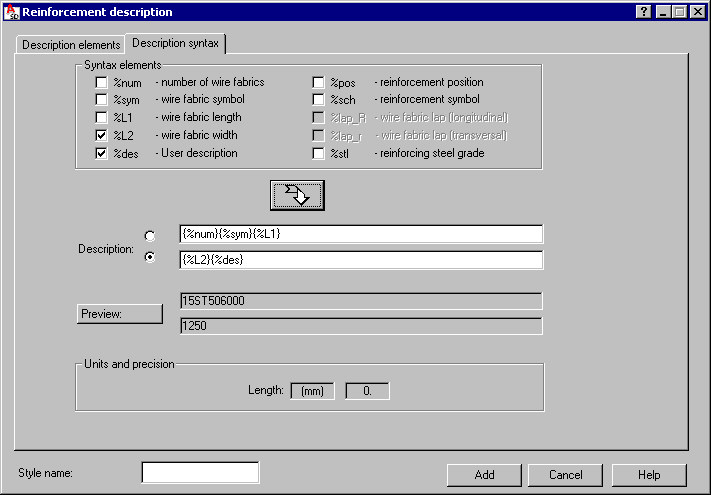 On the Description syntax tab of the Reinforcement description (wire fabric shape) dialog, you can define syntax of a description of a wire fabric shape.