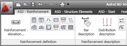 The ribbon displays automatically when a drawing is created or opened using the ASD Reinforcement workspace. You can display the ribbon manually using either of the following methods:
