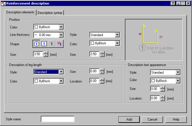 On the Description elements tab of the Reinforcement description (wire fabric symbol) dialog, you can define parameters such as colors, line thickness, font size, and label shape for a description.