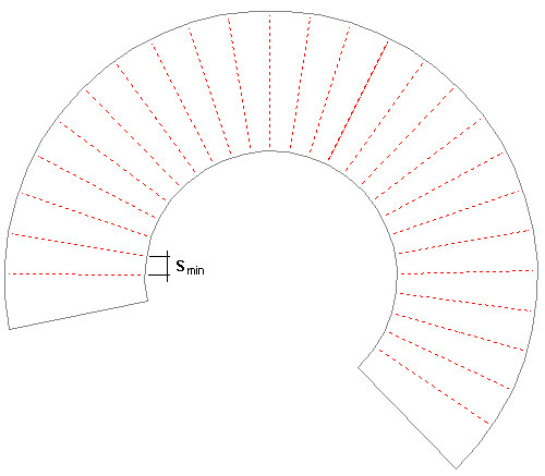 In the upper part of the dialog box there is the Minimal spacing edit field used to define the minimal spacing for bars distributed along the radius (a default value equals 50 mm). The minimal spacing concerns the distance between ends of distributed reinforcing bars positioned closer to the center of a circle/arc and must be greater or equal to a given value.