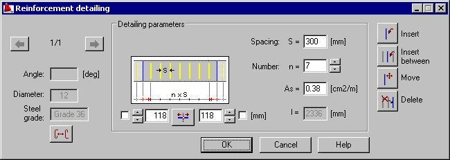 The Reinforcement detailing dialog displays after you define the basic parameters of reinforcement distribution. A cover ALWAYS denotes the distance measured from the reinforcement and perpendicular to the distribution line. The zone length is ALWAYS measured along the distribution line.
