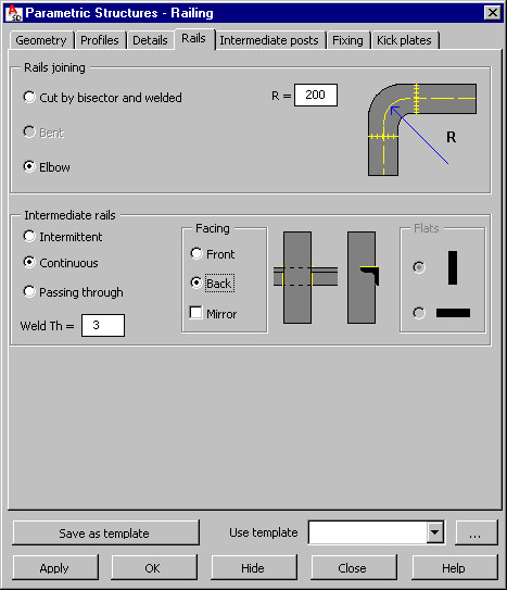 - rails are joined by means of additional elbows made of the same profile as the rail and welded to rails using workshop welds with a thickness equal to the thickness of walls in the rails. For this type of a rail joint, the bend radius R is defined. Define parameters for intermediate rails: