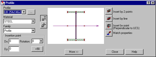 After you click on a characteristic point of a profile, the profile is translated and the edit fields Dx and Dy in the Insertion point field are populated automatically.