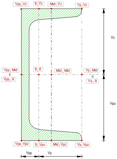 - Points presented in the drawing below whose coordinates are determined by the values Vy, Vpy, Vz, Vpz, Mid (they define a relative location of a point in the cross section)