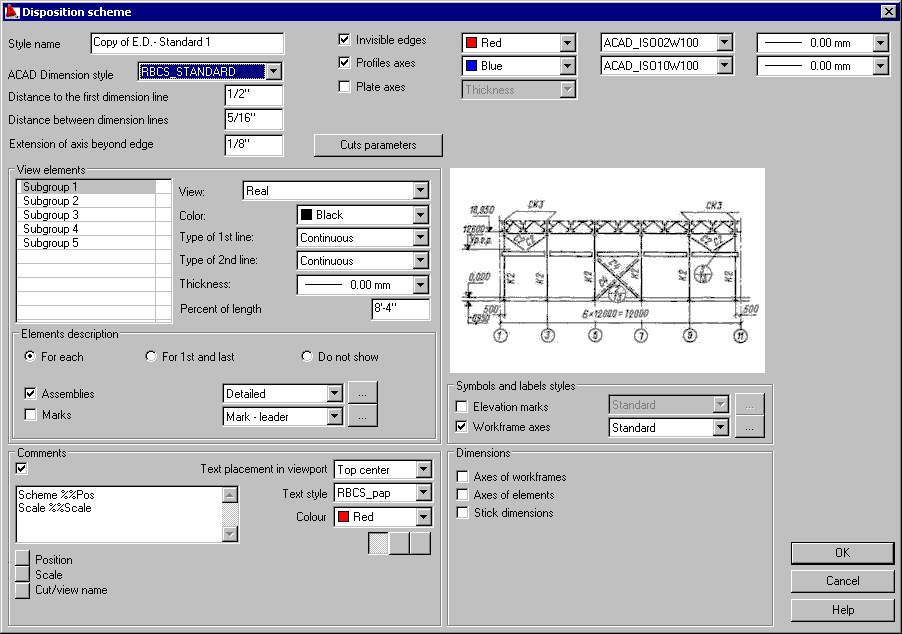 Use the Disposition scheme dialog to define a new style or to modify an existing dimensioning style for the disposition scheme (a group of elements constituting a structure model).