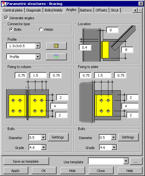 Parameters of the angle connection with the plate and the column are accessible only if a bolted angle-column/plate connection is selected: