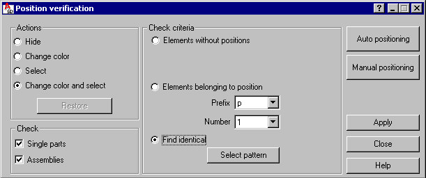 Under Actions, select an operation to perform on elements found during position verification (Hide, Change color, Select, or Change color and select). The effect of an action is remembered until you click Restore or until the dialog is closed and regeneration is carried out.