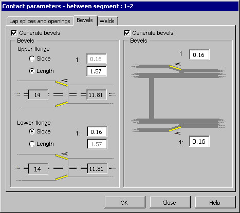 On the Bevels tab of the Contact parameters dialog, you can define parameters of the connection between 2 segments of a multisegment beam (bevels generated for flanges of a plate girder).