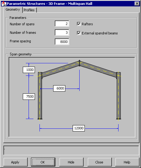 - Ribbon: ASD - Model > Parametric structures > Multispan frame
