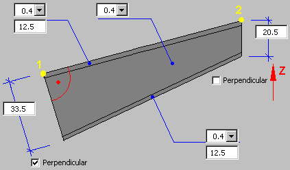 - If Perpendicular is not selected (at the beam beginning or end), the edges of the web plate and plates of beam flanges at the beginning or at the end of the beam are parallel to the Z axis of the local coordinate system (UCS) (see the drawing below, in which Perpendicular is turned off for point 2).