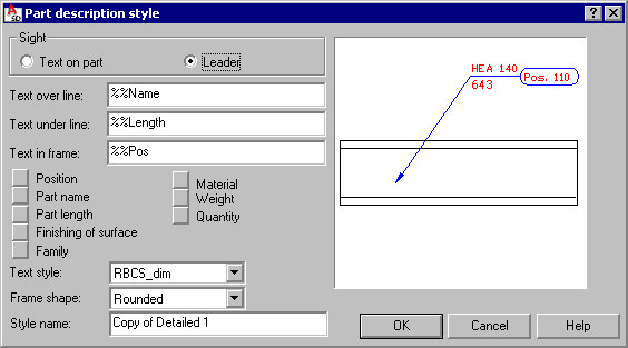 Use the Part description style dialog to define a new style or modify an existing style of part or assembly description.