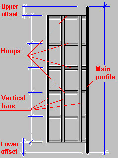 Elements composing the cage are displayed in the drawing below. Number of hoops and vertical bars are defined in the dialog, and there must be at least one profile (main bar) in order to define a cage.