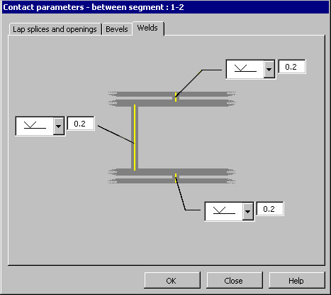 On the Welds tab of the Contact parameters dialog, you can define parameters of welds generated between connected segments of a generated multisegment beam.