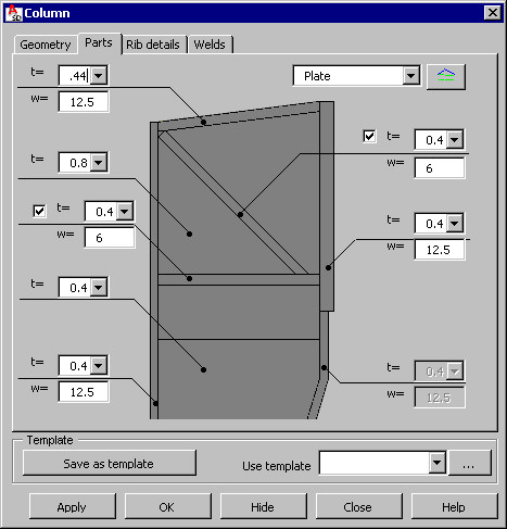 After you finish defining dimensions of the plate girder/parts, click the Welds tab to display the Column - Welds dialog.
