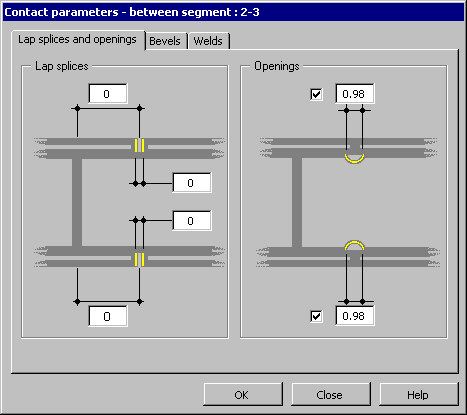 On the Lap splices and openings tab of the Contact parameters dialog, you can define parameters of the connection between 2 segments of a multisegment beam.