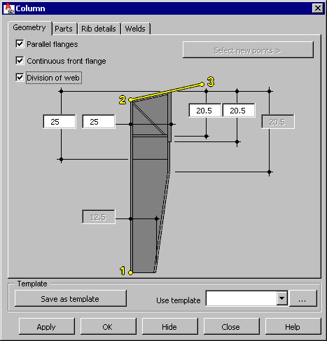 Point 1 is the beginning point of a plate girder (the first point defined in a drawing), positioned at the lower part of the column in the middle of the back flange. Point 2 is the end point of a plate girder (top point of the column), positioned in the upper part of the column in the middle of the back flange, and point 3 defines the incline of the upper part of the column (for example, it may be the point which determines the roof ridge in a frame).