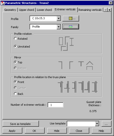 After you finish defining Roof Truss - Geometry click the Extreme verticals or Remaining verticals tab. Using the options on either tab, you can assign bar profiles and types of bar families to verticals.