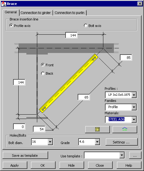 The Brace dialog has 3 tabs: General, Connection to girder, and Connection to purlin. On the General tab, define parameters of a supporting element (this is an angle selected from the database). On the 2 remaining tabs, define parameters of connection of the brace with the girder and the purlin.