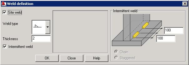 If you select Intermittent weld, you can define an intermittent fillet weld (composed of many segments of single welds). The drawings below include the following designations: