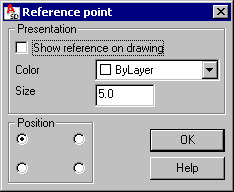 Position, size, and color of the reference point can be configured in the Reference point dialog,which opens when you click Ref. point in the New dimensioning style dialog.