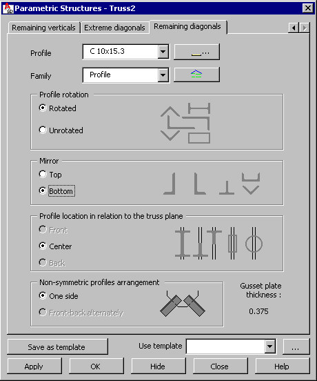 At the bottom of the dialog is the Use template selection field, which contains user-defined templates (schemes) of trusses. After you define truss geometry, you can save the settings by typing a name in the Use template field and clicking Save as template. In the future, after you begin to define a truss, you can select the name of a saved template so that all its parameters will be applied to the new truss.
