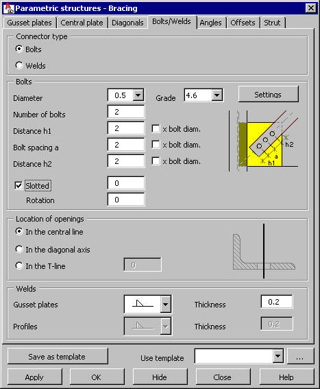 For Connector type, specify either Bolts or Welds to be used in the defined bracing. The options that are required to define the connection parameters depend on the selection made.