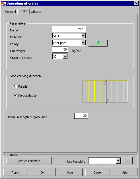 On the Grate tab of the Spreading of grates dialog, define grate parameters.