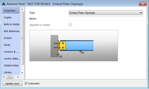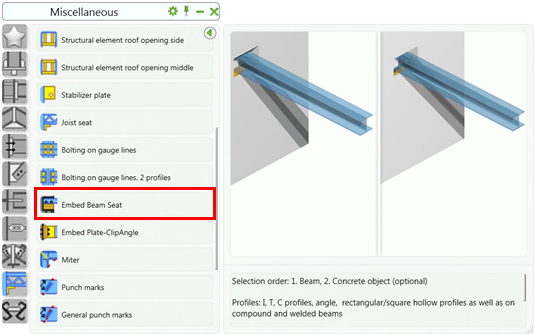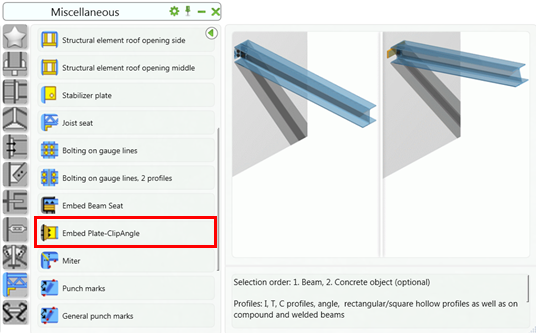 The Embed Plate-ClipAnglejoint can be used only between specific types of concrete elements (wall, slab, beam) and some of the steel sections (I, T, C, L, welded, compound or tapered sections).