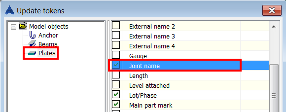 - Next, select the element added by the joint (plates - in current example) for which you will display the joint name using labels. Choose the token used by the label "Joint name" and click OK.