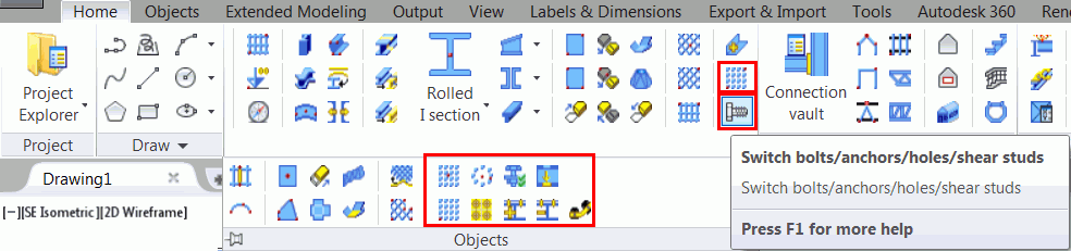 You create bolt patterns, anchor patterns, hole patterns and shear studs with the same commands that are grouped on the Objects tab Objects tab