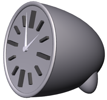 The alarm clock shown in the following image is made from a half-sphere, with a torus for the rim and cubes for the hands. The clock is assembled first, and then grouped and rotated so that the face is angled upwards. Finally, two scaled spheres are used for feet. Read the help documentation on the Edit > Duplicate > Object