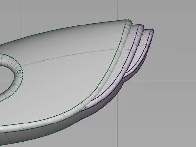 When the design is resolved, you would trim away the parts of the surfaces that are intersecting the body, to create a continuous outer surface. This trimming is covered in Part 8, an optional extra stage in this tutorial.