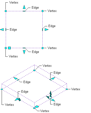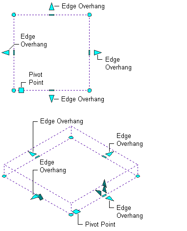 The types of editing grips available for a selected slab or roof slab depend on the view direction. As shown in the following illustrations, Edge, Edge Overhang, Vertex, and Pivot Point grips are displayed in both plan and three-dimensional (3D) isometric views. Angle, Vertical Offset, Horizontal Offset, and Thickness grips are available only in 3D isometric views.