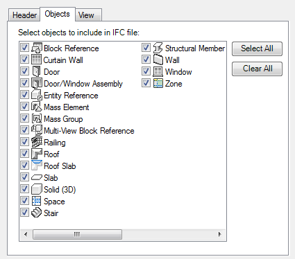 - Click the Objects tab and select the objects to be included in the IFC file.