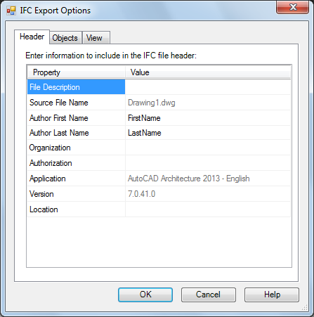 The name of the drawing active on your screen displays on the Header tab of the IFC Export Options dialog box. You can add information about the drawing file to be exported, such as a description of the drawing, the author and company name, authorization data, and the geographic location of the building. For example, you could enter the description of a structural drawing as Structure for Commercial Building 152 on the Header tab. This information displays in the header of the IFC file when the file is viewed.