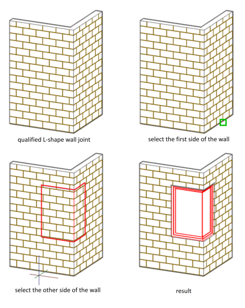 | a corner window in a wall | select a qualified L-shaped wall joint. Specify an insertion point along the second wall. |