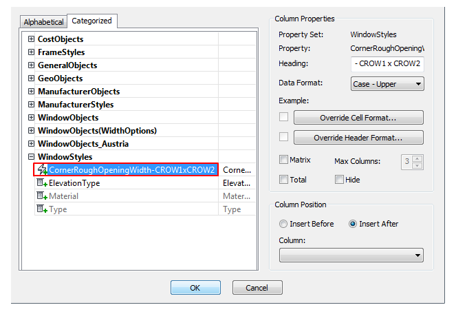 In the Add Column dialog box, under Window Styles select Corner Rough Opening Width – CROW1 x CROW2.
