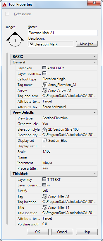 | Arrow | Section/ Elevation | Define the block for the section/elevation mark arrow. |